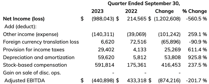 - Adjusted EBITDA of ($441,000) compared to $433,000 in the prior-year quarter. The Adjusted EBITDA result includes approximately $1.078M in costs related to the M&A activities, proxy-related expenses and separation expenses noted above. Without these costs, Adjusted EBITDA would have been approximately $637,000.